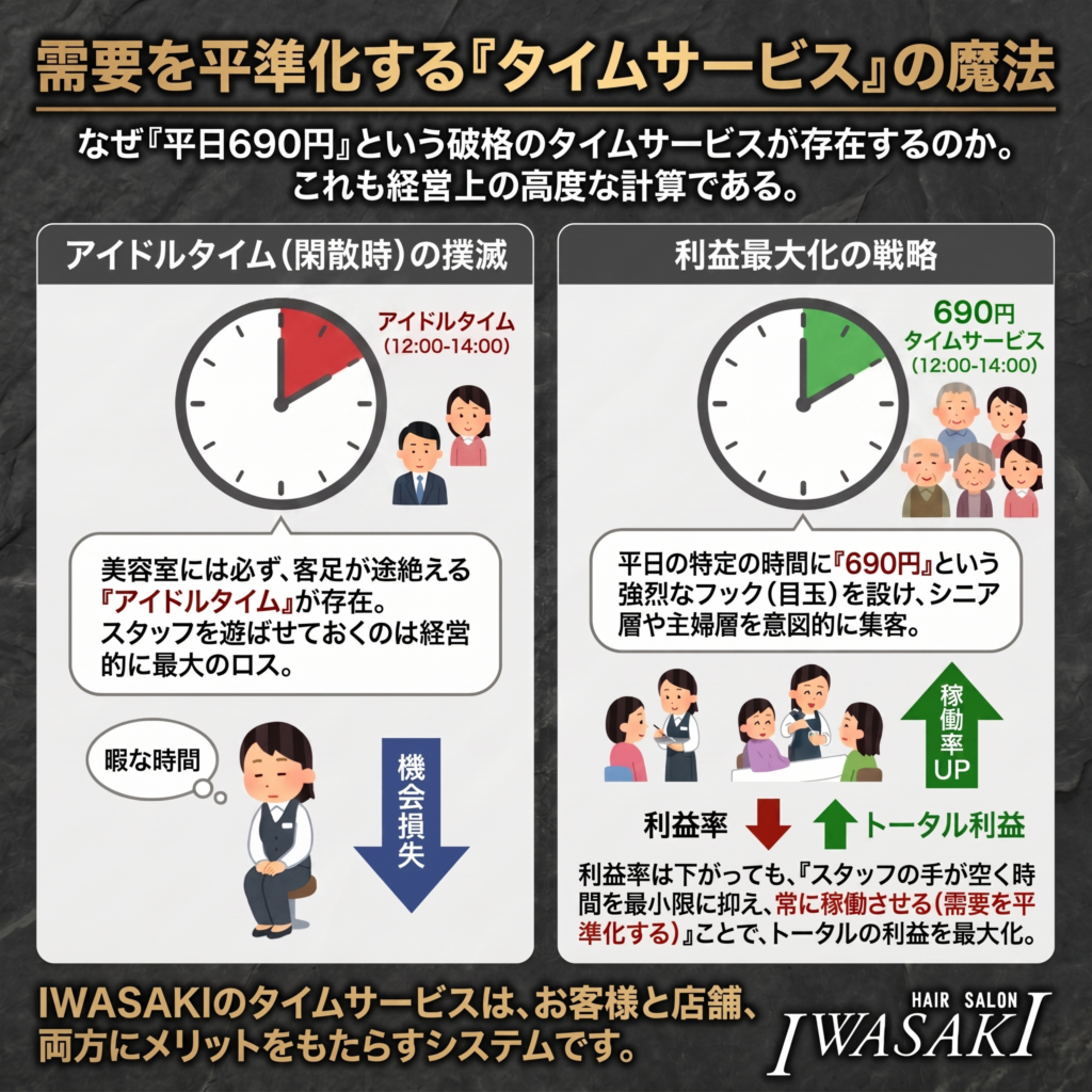 - 利益率は下がっても、「スタッフの手が空く時間を最小限に抑え、常に稼働させる(需要を平準化する)」ことで、トータルの利益を最大化する戦略なのだ。