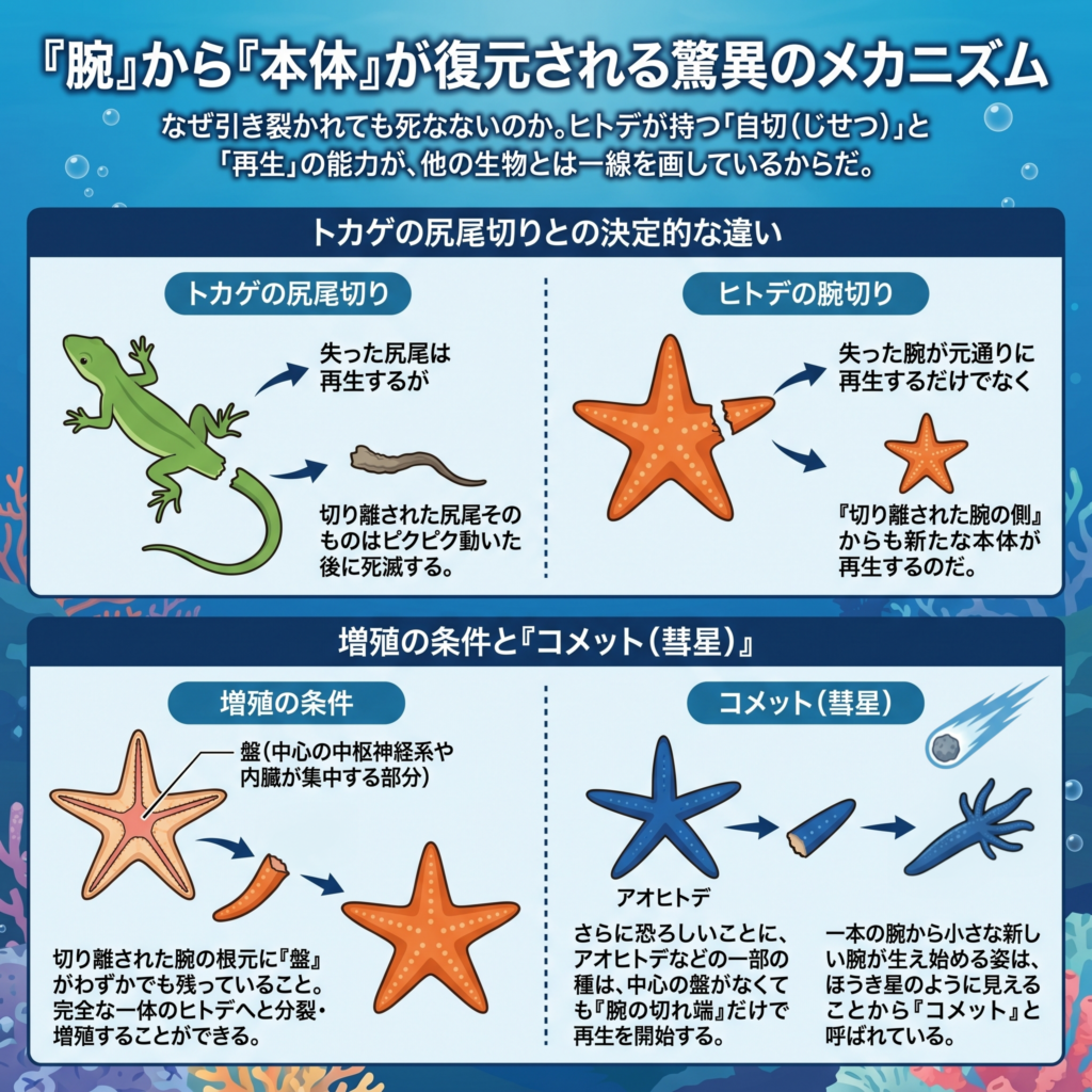 • さらに恐ろしいことに、アオヒトデなどの一部の種は、中心の盤がなくても「腕の切れ端」だけで再生を開始する。一本の腕から小さな新しい腕が生え始める姿は、ほうき星のように見えることから「コメット」と呼ばれている。
