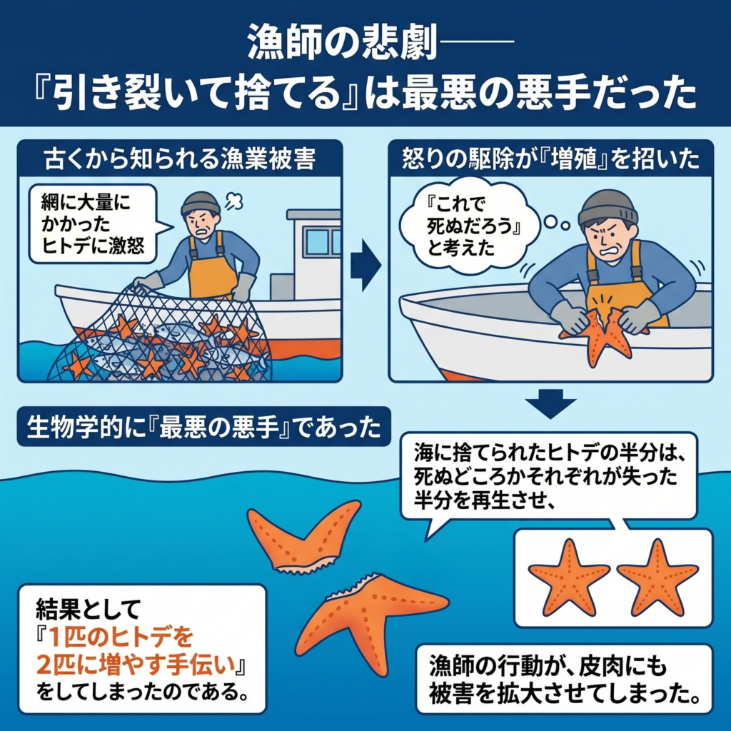 • しかし、これは生物学的に「最悪の悪手」であった。海に捨てられたヒトデの半分は、死ぬどころかそれぞれが失った半分を再生させ、結果として「1匹のヒトデを2匹に増やす手伝い」をしてしまったのである。