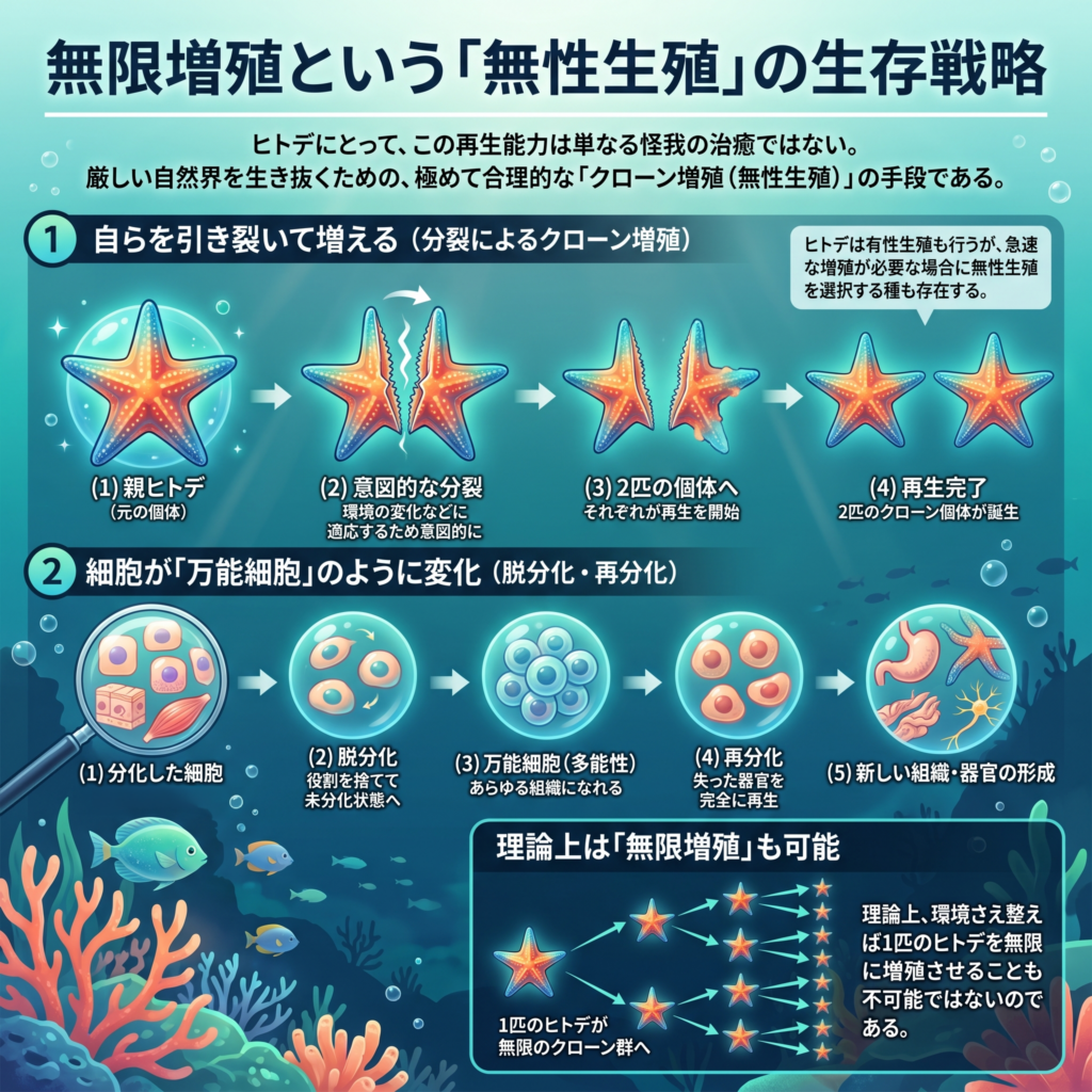 ヒトデにとって、この再生能力は単なる怪我の治癒ではない。厳しい自然界を生き抜くための、極めて合理的な「クローン増殖(無性生殖)」の手段である。