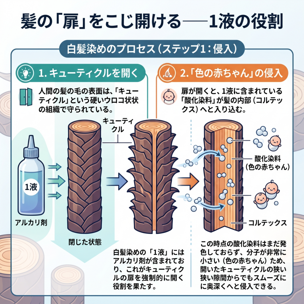 - 白髪染めの「1液」にはアルカリ剤が含まれており、これがキューティクルの扉を強制的に開く役割を果たす。