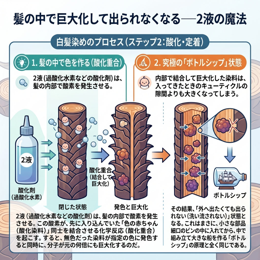 - この酸素が、先に入り込んでいた「色の赤ちゃん(酸化染料)」同士を結合させる化学反応(酸化重合)を起こす。