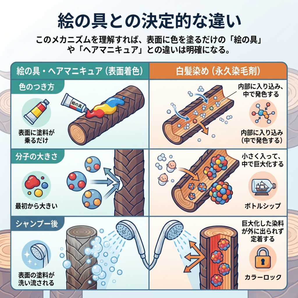 このメカニズムを理解すれば、表面に色を塗るだけの「絵の具」や「ヘアマニキュア」との違いは明確になる。