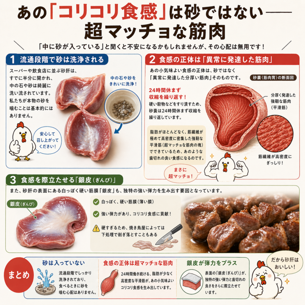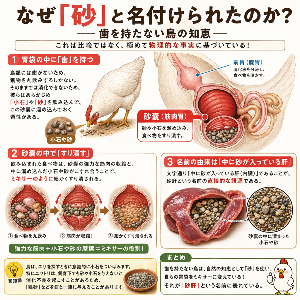 次に焼き鳥屋で砂肝を注文し、あのコリコリとした食感を味わう時。それは砂を噛んでいるのではなく、鳥の強靭な生命力を支えていた“究極の筋肉”を堪能しているのだと、少しだけ思いを馳せてみてはいかがだろうか。