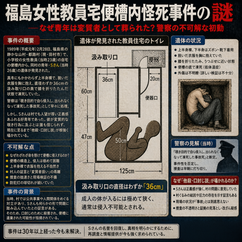 小学校の女性教員(当時23歳)が帰宅し、トイレ(汲み取り式)に入って何気なく便器の中を覗き込んだところ、人の靴のようなものを発見。警察と消防が駆けつけ、便槽を破壊して引き出されたのは、同村の青年会に所属する男性・Sさん(当時26歳)の遺体であった。