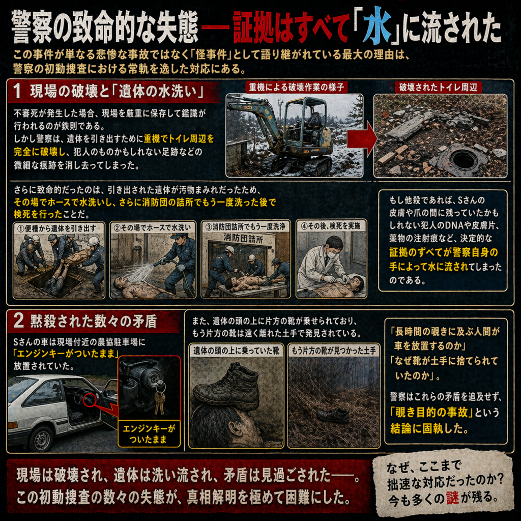 - 不審死が発生した場合、現場を厳重に保存して鑑識が行われるのが鉄則である。しかし警察は、遺体を引き出すために重機でトイレ周辺を完全に破壊し、犯人のものかもしれない足跡などの微細な痕跡を消し去ってしまった。