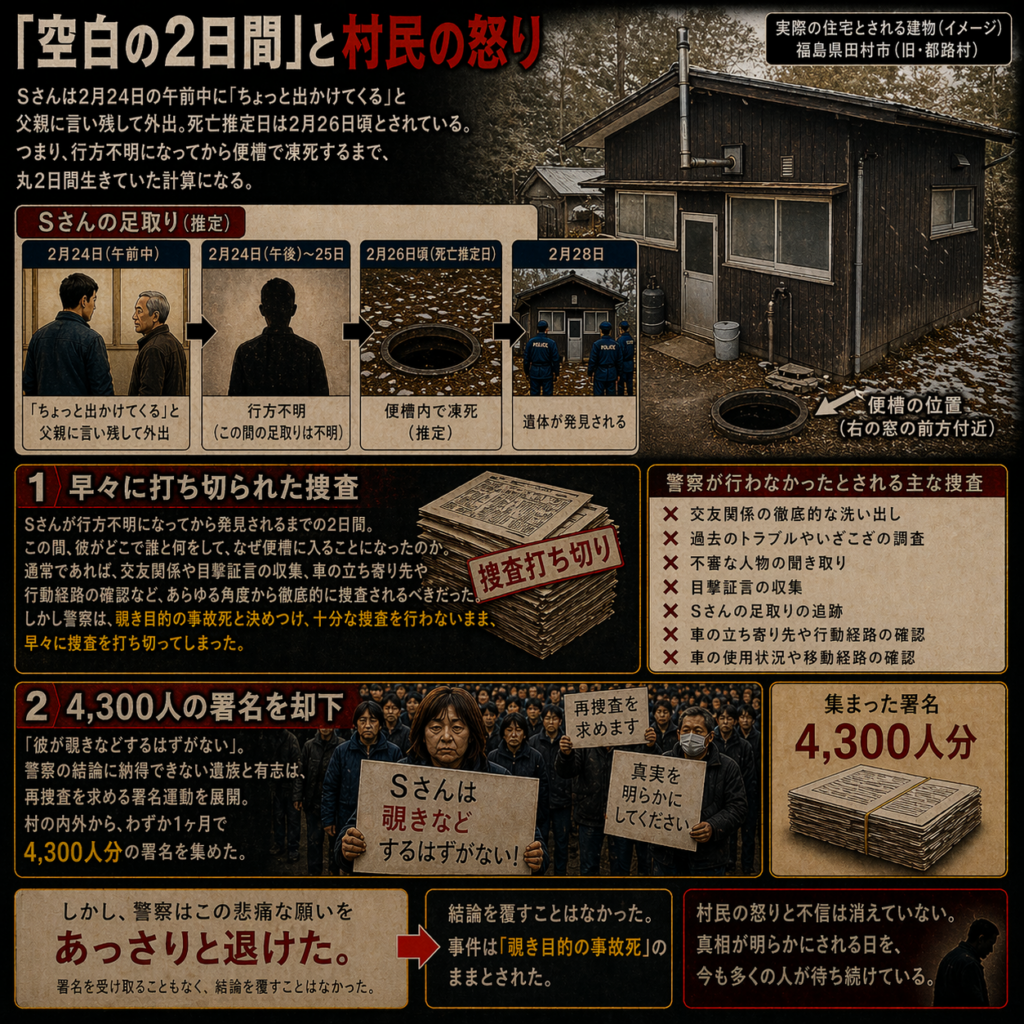 真冬にもかかわらず上半身裸で、脱いだ衣服を胸に抱え、直径わずか36cmの汲み取り口の奥で膝を折りたたんだ状態で凍死していたSさん。