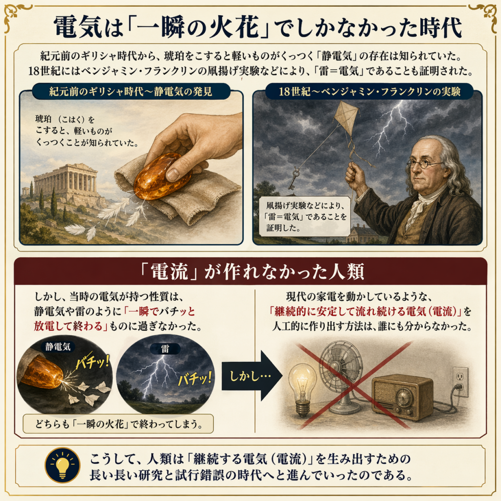 • しかし、当時の電気が持つ性質は、静電気や雷のように「一瞬でバチッと放電して終わる」ものに過ぎなかった。