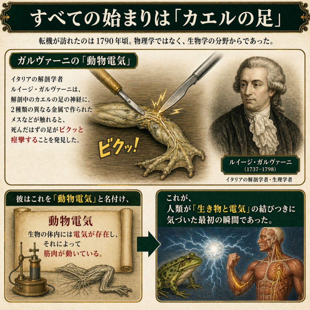 • これが、人類が「生き物と電気」の結びつきに気づいた最初の瞬間であった。