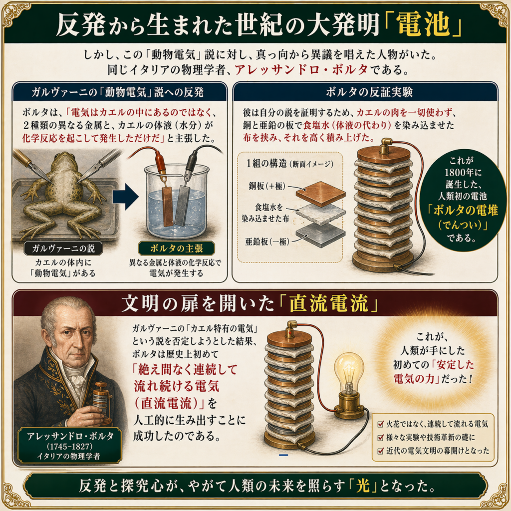 しかし、この「動物電気」説に対し、真っ向から異議を唱えた人物がいた。同じイタリアの物理学者、アレッサンドロ・ボルタである。