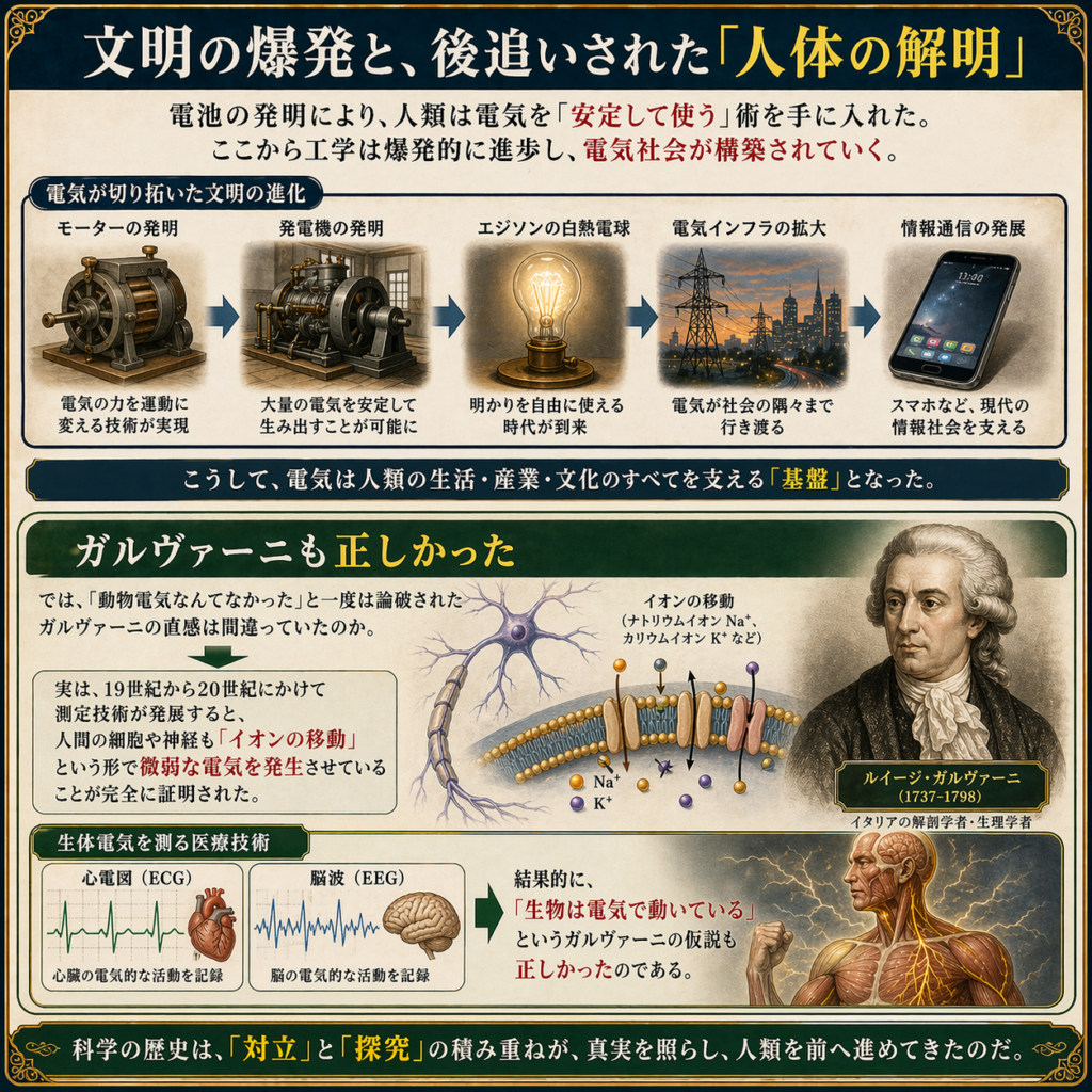 電池の発明により、人類は電気を「安定して使う」術を手に入れた。ここから工学は爆発的に進歩し、モーターや発電機、エジソンの白熱電球へと繋がり、現在のインフラや情報通信(スマホなど)を支える電気社会が構築されていく。