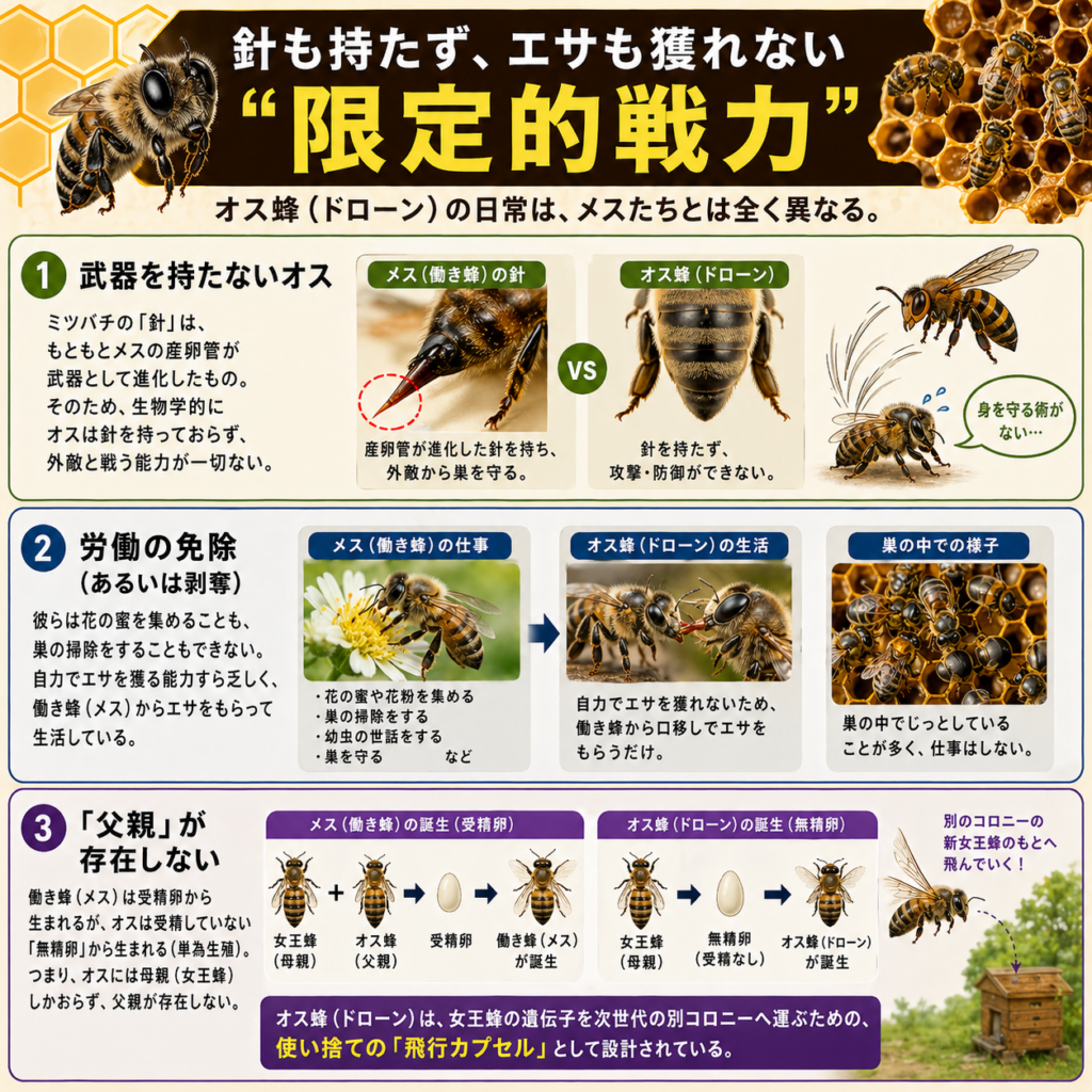 - ミツバチの「針」は、もともとメスの産卵管が武器として進化したものである。そのため、生物学的にオスは針を持っておらず、外敵と戦う能力が一切ない。