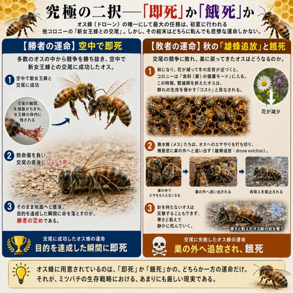 オス蜂の唯一にして最大の任務は、初夏に行われる他コロニーの「新女王蜂との交尾」である。しかし、この任務の結末には、どちらに転んでも悲惨な運命しか用意されていない。
