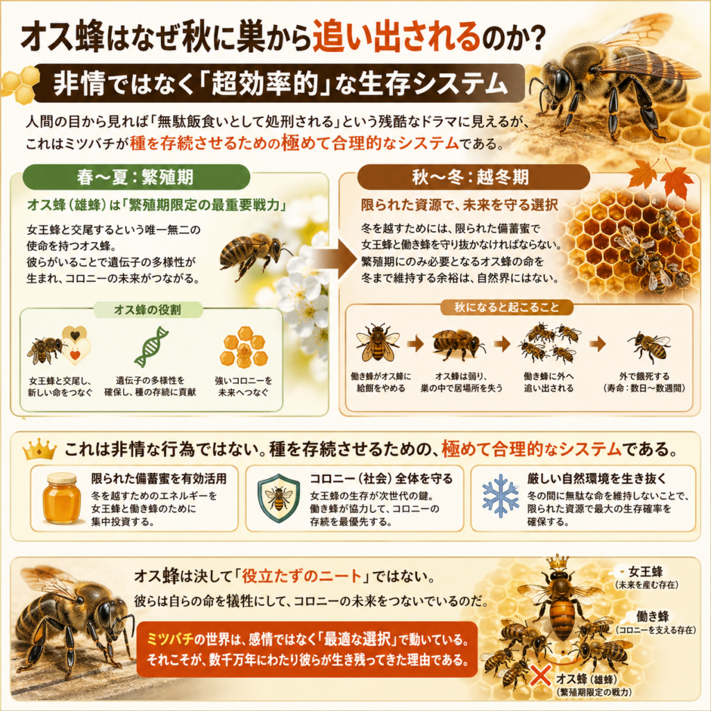 - 秋になり、花が減って冬の足音が近づくと、コロニーは「食料(蜜)の備蓄モード」に入る。この時期、繁殖期を終えたオスは、群れの生存を脅かす「コスト」と見なされる。
