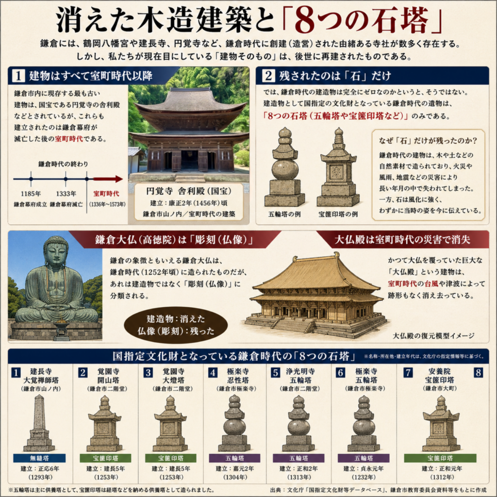 - 有名な鎌倉大仏(高徳院)は鎌倉時代に造られたものだが、あれは建造物ではなく「彫刻(仏像)」に分類される。かつて大仏を覆っていた巨大な「大仏殿」という建物は、室町時代の台風や津波によって跡形もなく消え去っている。