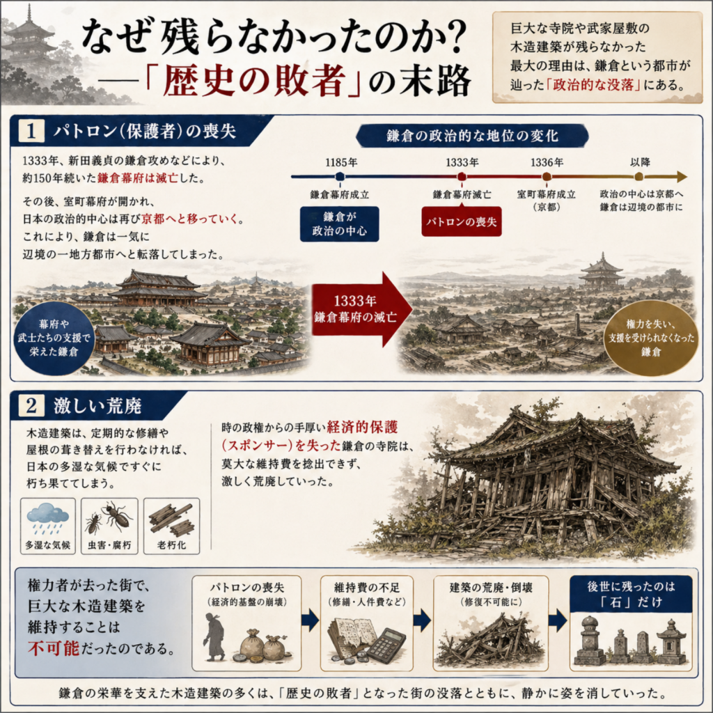 - 時の政権からの手厚い経済的保護(スポンサー)を失った鎌倉の寺院は、莫大な維持費を捻出できず、激しく荒廃していった。権力者が去った街で、巨大な木造建築を維持することは不可能だったのである。