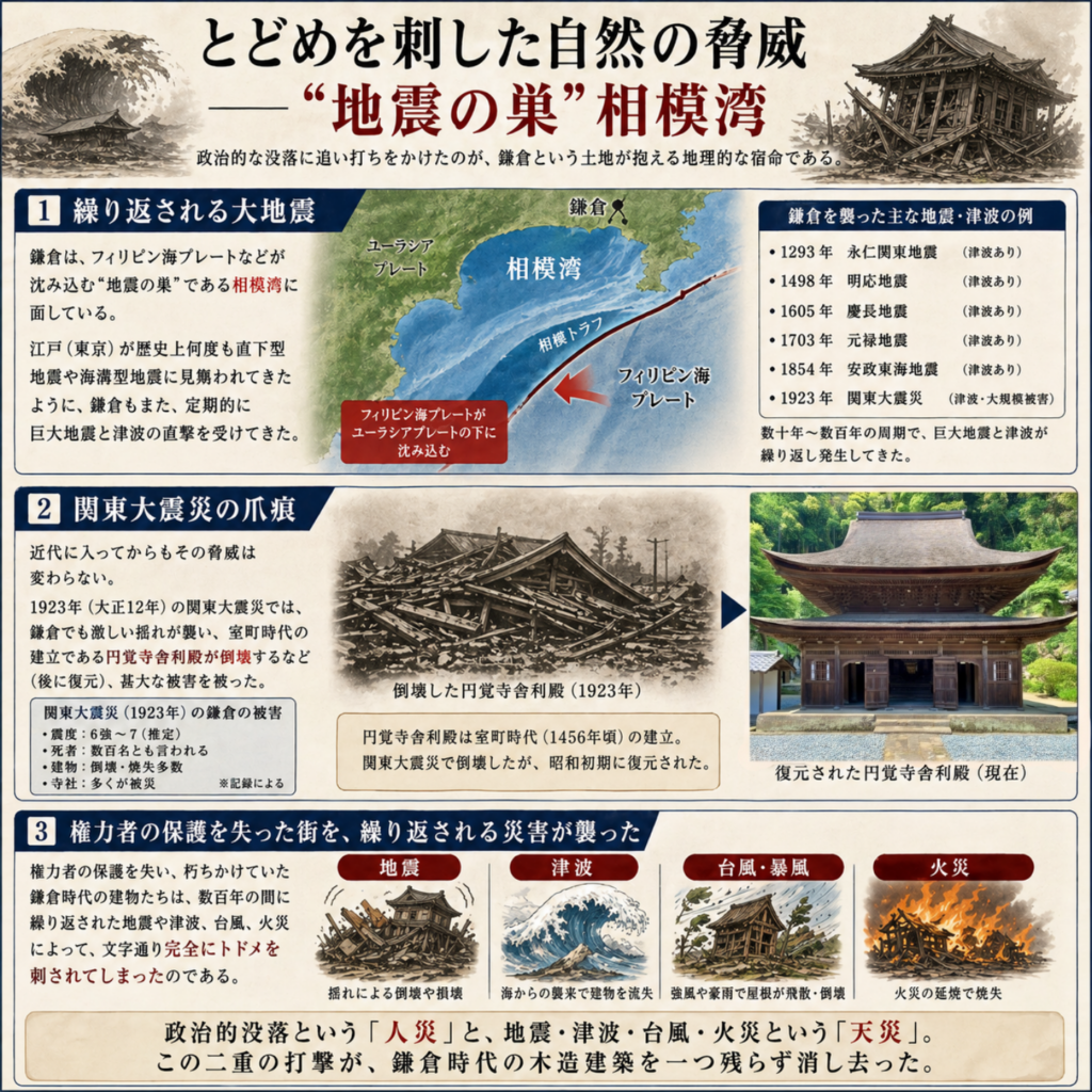 結論として、鎌倉に鎌倉時代の建物がないのは、「政権交代による都市の没落」と「相模湾の苛烈な自然災害」という、二つの容赦ない歴史の波に飲み込まれた結果であった。