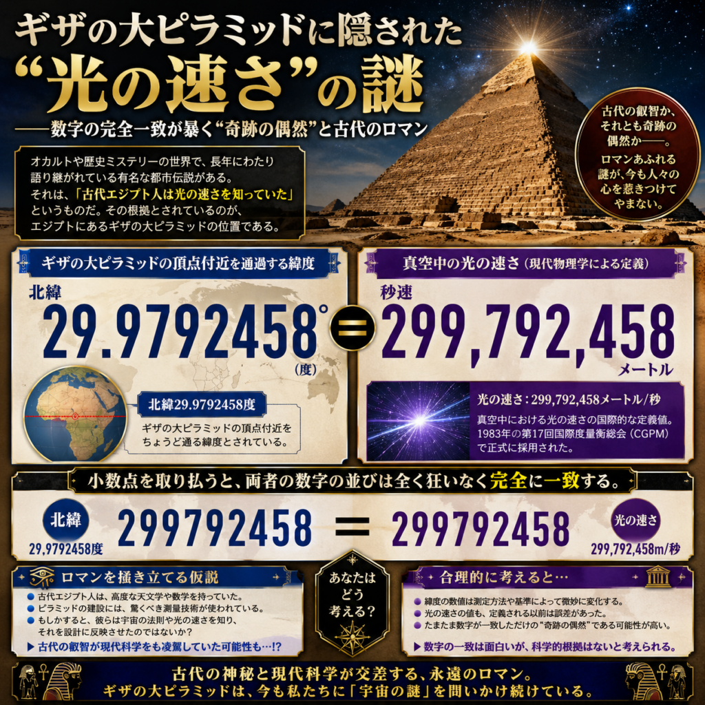 光速との一致が偶然であったとしても、古代エジプト文明が並外れた技術を持っていたという事実は少しも色褪せない。