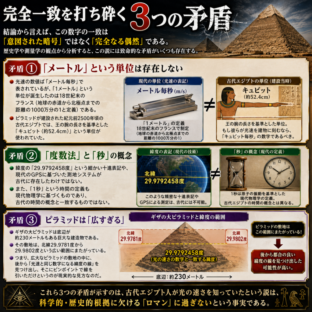 - ピラミッドが建設された紀元前2500年頃の古代エジプトでは、王の腕の長さを基準とした「キュビット(約52.4cm)」という単位が使われていた。もし彼らが光速を建物に刻むのであれば、「キュビット毎秒」の数字になっていなければ不自然である。