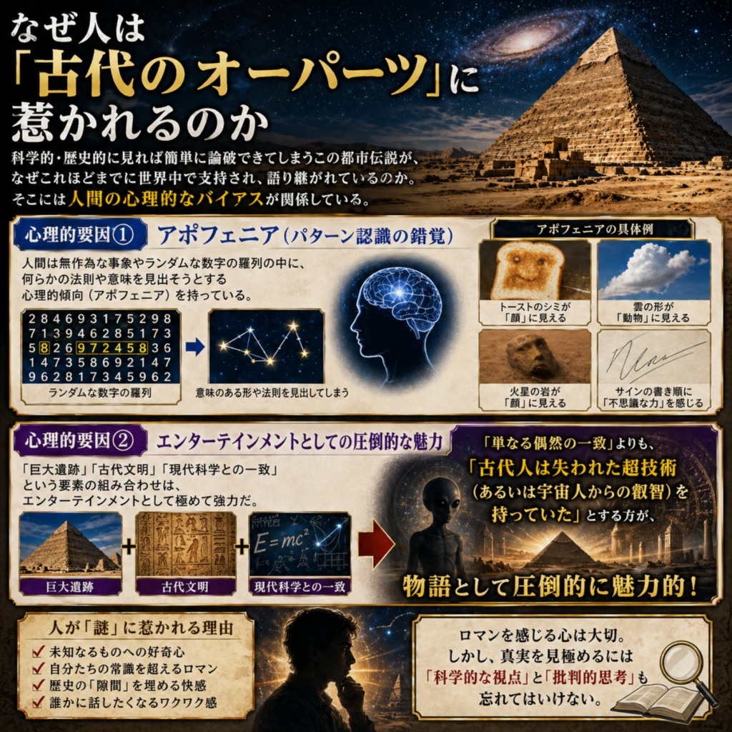 - 「巨大遺跡」「古代文明」「現代科学との一致」という要素の組み合わせは、エンターテインメントとして極めて強力だ。「単なる偶然の一致」よりも、「古代人は失われた超技術(あるいは宇宙人からの叡智)を持っていた」とする方が、物語として圧倒的に魅力的なのである。