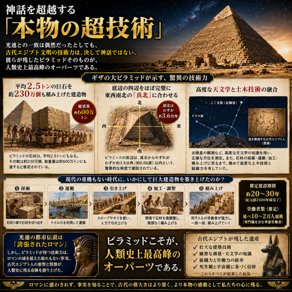 光速の都市伝説が誇張されたものであっても、彼らが残したピラミッドそのものが、人類史上最高峰のオーパーツであることは揺るぎない事実である。