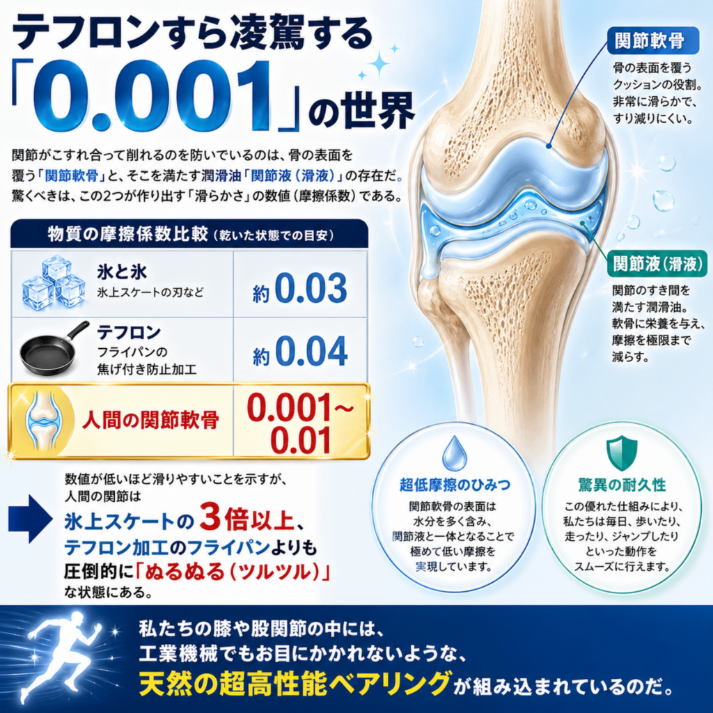 数値が低いほど滑りやすいことを示すが、人間の関節は氷上スケートの3倍以上、テフロン加工のフライパンよりも圧倒的に「ぬるぬる(ツルツル)」な状態にある。